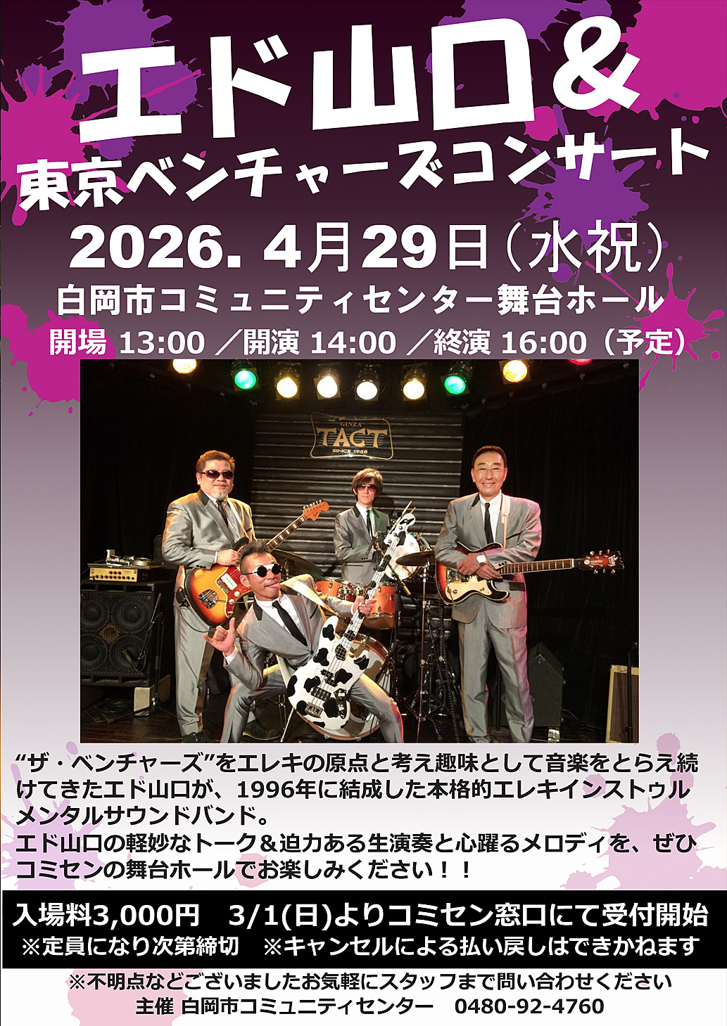 エド山口&東京ベンチャーズコンサート☆3月より予約受付!☆ ■□■ 埼玉県白岡市のホールでライブだ!! ■□■ ■会場:白岡市コミュニティセンター・ホール ■開場:13:00 開演:14:00 終演:16:00(予定) ■入場料:3,000yen(3月1日よりコミュニティセンター窓口にて受付開始) ■お問合せ:白岡市コミュニティセンター TEL.0480-92-4760 ■白岡市コミュニティセンター ホームページ:https://shiraokaci.machikatsu.co.jp/shiraoka-cc/index.html |